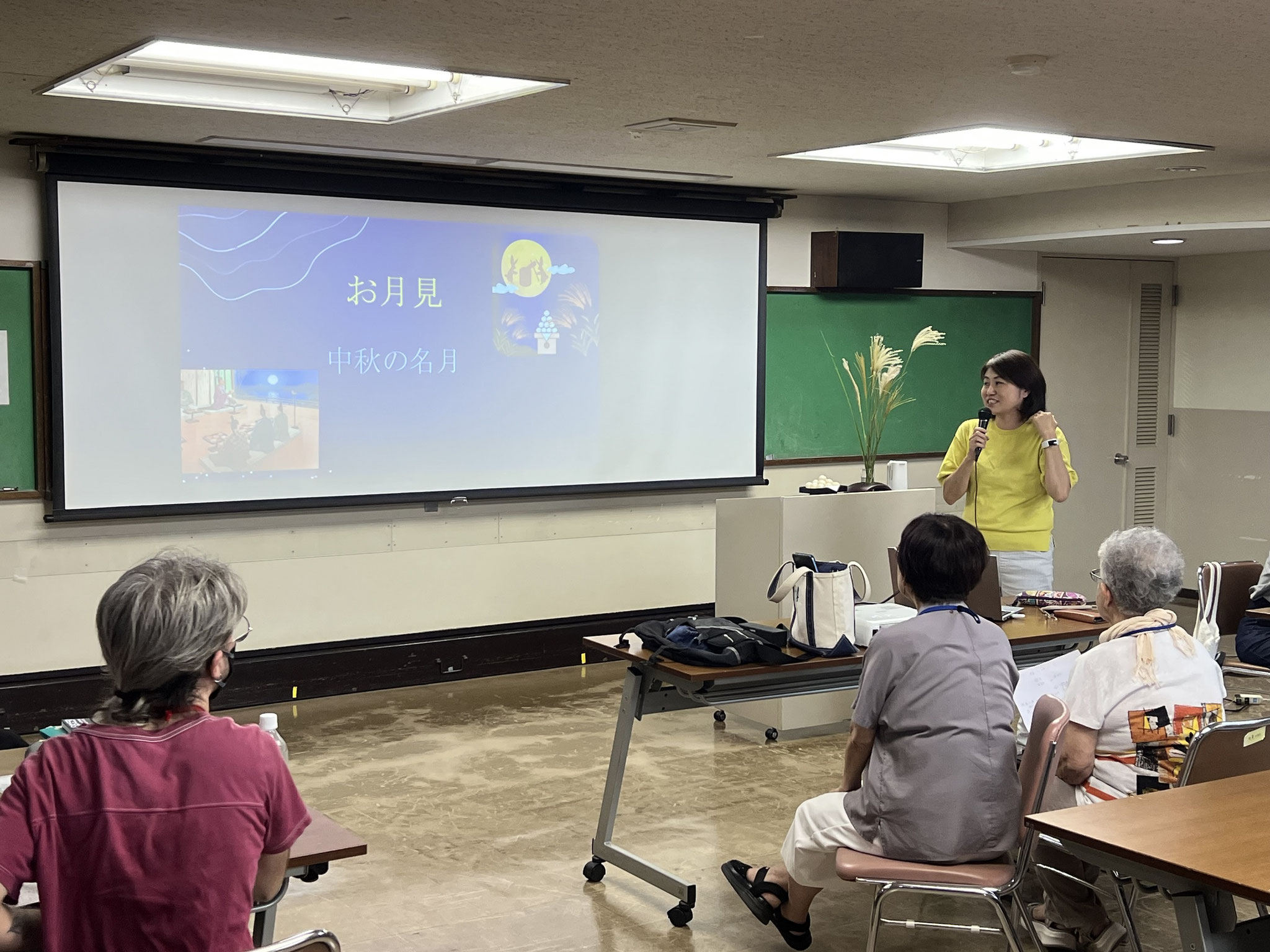 9月の日本語教室(夜クラス)では、「お月見(中秋の名月)」について紹介しました。お月見の雰囲気に飾り付けた教室で、お月見について学びました。